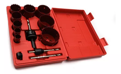 Jogo de 12 peças de serras copo Bimetal , altura 2″, diâmetro dos copos ((3/4″, 7/8″, 1-1/8″, 1-3/8″, 1-1/2″, 1-3/4″,2″, 2-1/4″, 2-1/2″), 2 mandris de 1/4″ (9/16″, 1-3/16″), Bimetal, possui borda construída em aço de alta velocidade, e corpo em mola de aço. As duas seções são soldadas juntas para formar uma única lâmina.