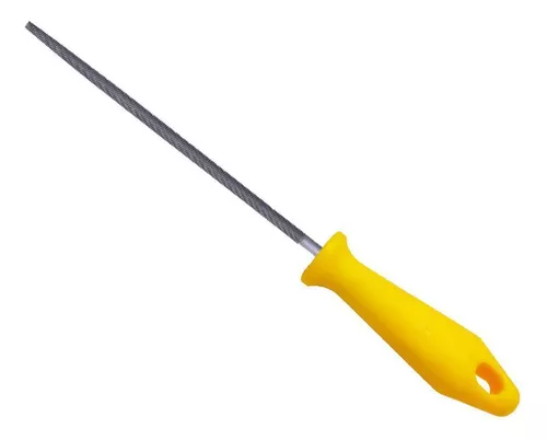 ‘Lima bastarda chata, meia cana e redonda, face dupla, para superfícies planas ou convexas, comprimento 6 e 8, com cabo de PVC endurecido de 12 cm, orifício para pendurar, para afiar enxadas, arados, machados, facões, facas, tesouras e ferramentas de corte em geral.